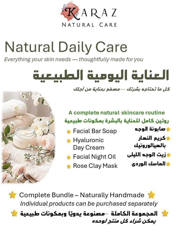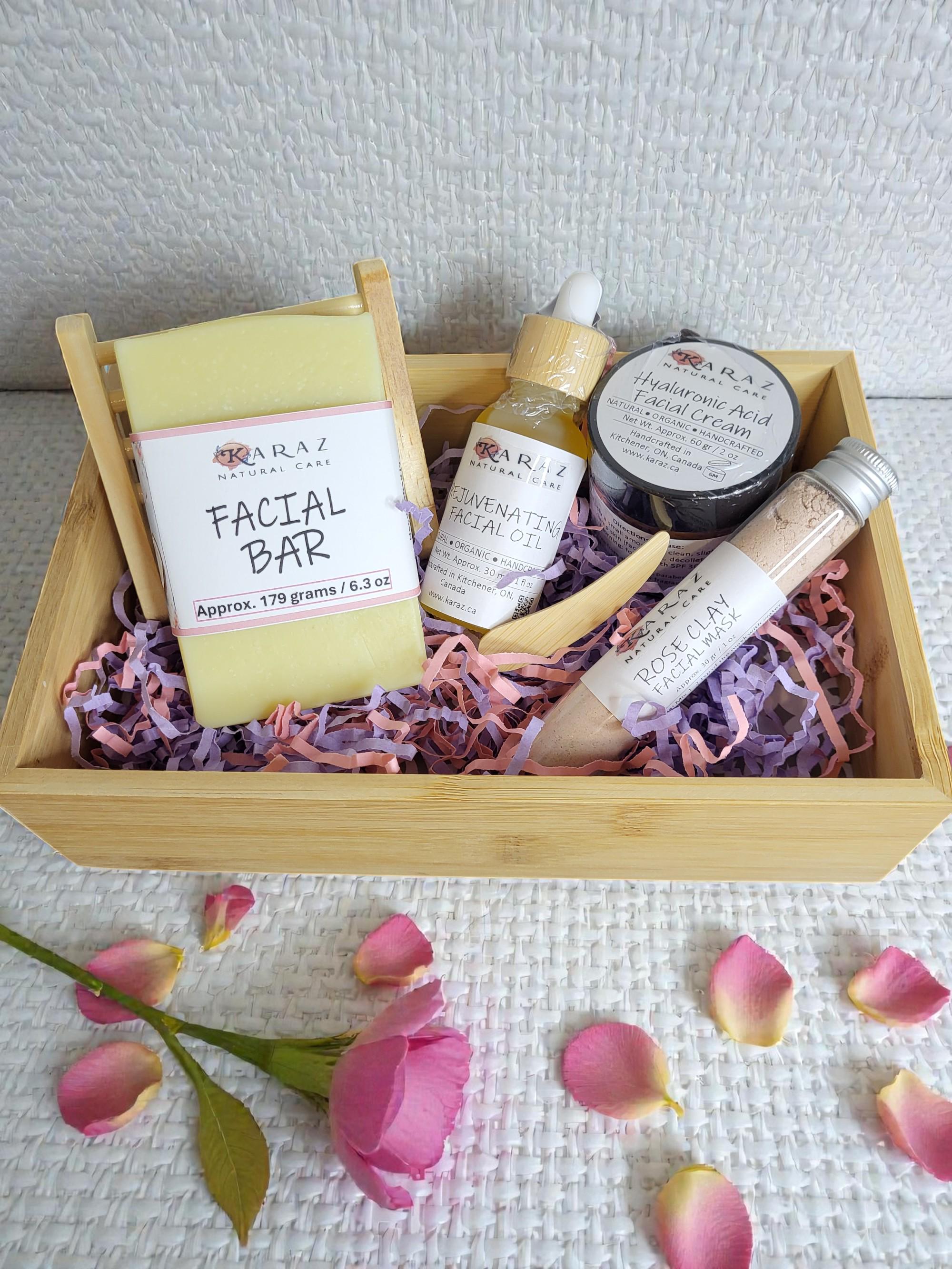 This handcrafted gift set offers a complete facial care routine designed to cleanse, nourish, and care for the skin. It includes a handcrafted bar soap for gentle cleansing, a hydrating facial cream, a nourishing facial oil, and a rose clay facial mask to help refresh and purify the skin.